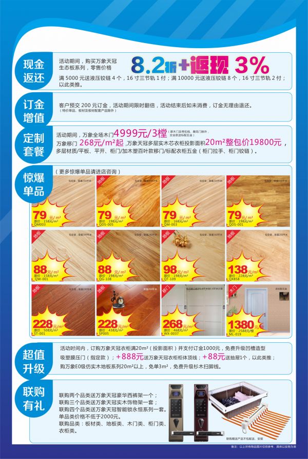 据本次活动负责人湖南旺德府木业有限公司联席总经理王贵民介绍,活动期间,消费者购买万象天冠生态板系列,零售价格满5000元送液压铰链4个,16寸三节轨1付;满10000元送液压铰链8个,16寸三节轨2付;以此类推。此外,万象天冠生态板系列,零售价格8.2折+返现3%,还有多款惊爆单品79元起等各种优惠活动。