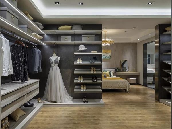 无侧板的设计,让整个衣帽间的视野变得开阔,再也不会感觉到拥挤了。