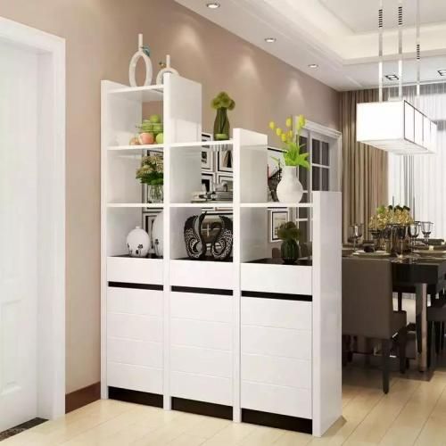 开放式柜一般采用悬空而定设计方式,在下方留出一个拖鞋的摆放区。上方的柜面上可以摆放一些装饰盒或者相框之类的。