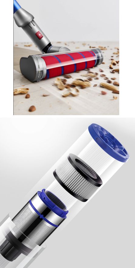 首先,苏泊尔吸尘器是专为中国家庭设计,蓝色的外观设计的很有科技感,主机部分的电机和纳尘盒与把手设计成120°角,实际操作起来角度刚刚好,使用者腕部会有舒适的活动角度,不会有明显的乏累感。苏泊尔T3吸尘器下端采用74mm的宽口大嘴刷,配合8万转的数码电机,350w整体功率,吸力更强劲,大颗粒及缝隙积尘一网打尽,不用担心积灰、细尘、大颗粒残留,像米粒、坚果壳大小的颗粒也可以一次吸入。此外,苏泊尔T3吸尘器有一个强净过滤功能,五重过滤,效果堪比空净,含HEPA10滤网,过滤0.3μm颗粒物,效率可达 99.75%;过滤PM2.5,效率可达 99.99%,清洁效果,显而易见。