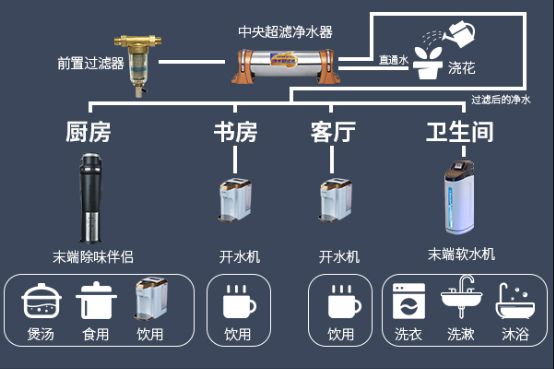 饮食用水:可以在厨房加装末端超滤伴侣,利用活性炭滤芯有效吸附水中的异色异味,让饮水口感更加清甜爽口,同时也让煮出来的饭菜更加美味可口。此外,还可以在厨房、客厅以及书房等场所加装急速开水机,随时为家人提供常温水和温度可调的热水,满足家人多样化的饮水需求。