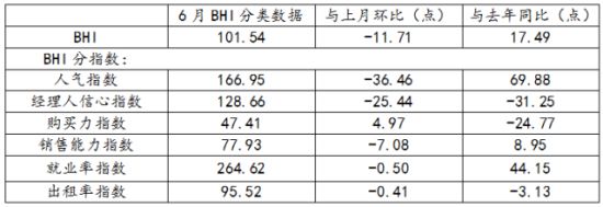 7月15日,商务部流通业发展司、中国建筑材料流通协会共同发布全国建材家居景气指数(以下简称“BHI”)。6月份BHI为101.54,环比下降11.71点,同比上涨17.49点。全国规模以上建材家居卖场6月销售额为858.4亿元,环比下降8.32%,同比上涨12.97%。上半年累计销售额为4647.0亿元,同比上涨4.70%。