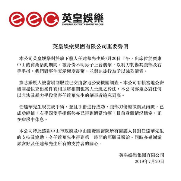 7月20日上午 ,著名演员任达华出席居然之家中山店开业活动时,被突然冲上台的陌生男子捅伤。新浪家居获悉,英皇娱乐方面刚刚对此事件发布回应声明,任达华被第一时间送往医院,经检查腹部和手指被刀刺伤,目前伤情稳定,无生命危险。