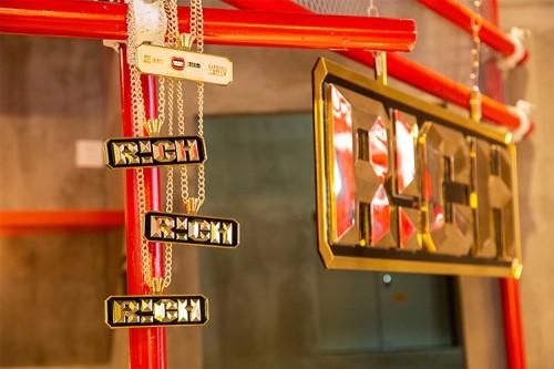 从整体来看店铺名中直接冠以爱奇艺,《中国新说唱》的logo,利用不同颜色的大胆拼接,重金属风格的怪咖周边壁画和明星制作周边海报,加上绚丽的灯光设计,大型的投影屏幕以及独属于嘻饮力店内动感十足的嘻哈音乐。直接在视觉和听觉上拿住了消费者的眼球。