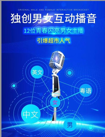 西银播音大师独创十二位青春闪亮主播男女互动播音,中文、英文、粤语自由穿插播音。大数据共享百万超市热歌歌单,能帮助超市、商场提高场景的热度,跟消费者有很好的吸引性,适合应用在多个场景上,比如开业、周年店庆、节假日活动、各种造物节户内户外活动广告促销、每天日常促销等等。