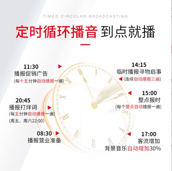 5、全球唯一智能Ai背景音乐,智能感应卖场客流,客流高峰时自动提升音乐音量,播音时自动降低音乐音量,动感十足。