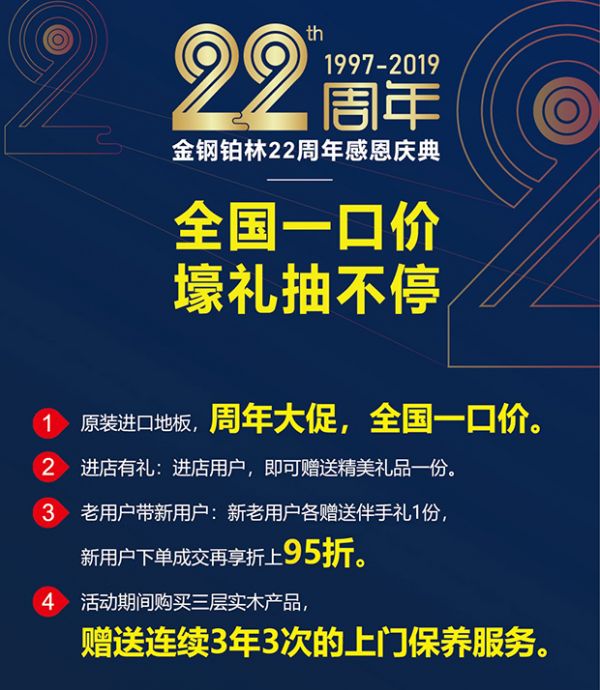 22年不仅是一个数字,更是众多消费者对金钢铂林多年的支持和信赖,为了感谢新老用户对金钢铂林的支持,本次活动不仅带来进店有礼,老用户带新用户折上折、买产品送保养、下单即抽奖等4重壕礼,更甄选欧洲3大高端地板品牌新品及爆款产品,全国一口价的超值优惠,7月13日-8月12日,活动期间你想要的各种优惠、惊喜,在金钢铂林专卖店都能找到!