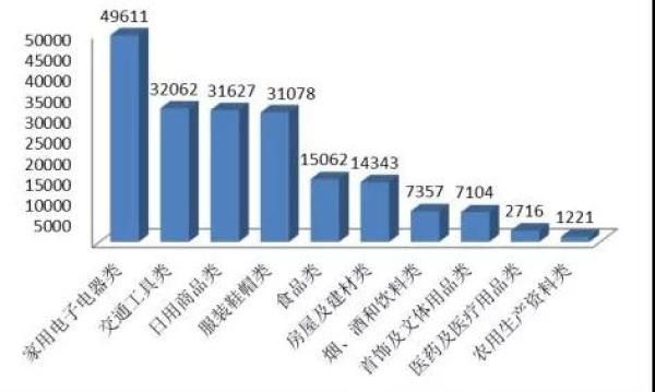 从商品类投诉来看,家用电子电器类、交通工具类、日用商品类、服装鞋帽类与食品类投诉量居前五位。