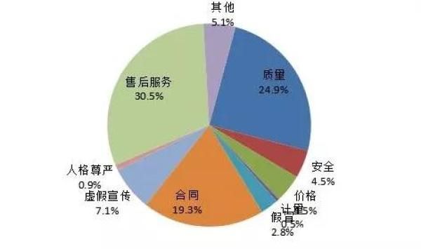 根据投诉性质分析,售后服务问题占30.5%,质量问题占24.9%,合同问题占19.3%,虚假宣传问题占7.1%,价格问题占4.5%,安全问题占4.5%,假冒问题占2.8%,人格尊严占0.9%,计量问题占0.5%,其他问题占5.1%。售后服务、产品质量和合同问题是引发投诉的主要原因,占投诉总量的七成以上。