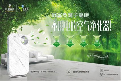 源于冠军磁砖的“负离子专利技术”,通过运用高纯度负离子天然矿物,在瓷砖胚体形成一层负离子功能层,让产品可以永久性释放出负氧离子。冠军负离子产品所释放的负离子被不带电荷的氧气捕获,生成负氧离子,让负离子释放量高达到3000±500个/cm³,相当于乡村野外的空气质量。冠军负离子瓷砖应用于家居装修,能有效分解室内甲醛、甲苯、TVOC等有害气体,对人体健康起到了极大的帮助作用。