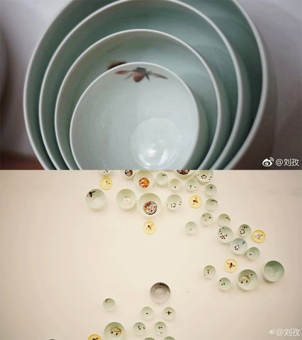 刘孜曾在微博中陈述一款盘子的设计灵感,“我的设计灵感来自巴塞罗那自然博物馆之旅。”从她晒出的图中可以看出,蜜蜂跃然于碗壁、盘底,形象十分生动。