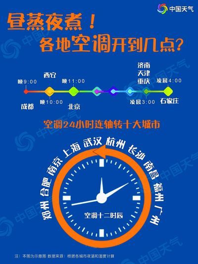 此次高温过程不仅导致多个城市白天酷暑难耐,而且夜间炎热感丝毫没有缓和,可谓昼蒸夜煮、火力十足。石妍分析,南京、上海、武汉、长沙、广州、杭州、南昌、福州、郑州、合肥等10大城市夜间气温仍维持在28℃以上,加上上述城市湿度普遍在80%以上,闷热感依旧明显,空调整晚都不能关;重庆、天津、济南、石家庄夜间气温在27℃-30℃之间,空调至少要开到凌晨3-4点;北京、西安、成都夜间气温在24℃-28℃之间,空调需持续开到夜间9-11点。
