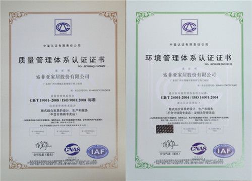 康纯板每一块板材都需要通过索菲亚严格的质检之后才可以进入生产环节。除了选材环保,索菲亚生产线更实现绿色生产,不仅对生产过程中的余料、废料集中回收统一处理,从源头处控制粉尘污染,可以确保生产全程环保和废弃料节能回收,还能最大程度上保证厂区的环境卫生和工人的身体健康。索菲亚多次获评“清洁生产企业”称号,还荣获ISO 9001质量管理体系认证和ISO 14001环境管理体系认证证书。