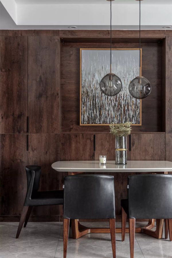 餐厅处的餐边柜选择了深木色的,和餐桌椅起到呼应的效果,看起来很有整体感。这种略带复古感的颜色,也让餐厅看起来更格调感。