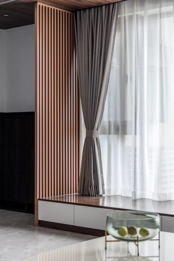 整排的飘窗底部都是柜子,台面和上方的吊顶都做了深木色的,结合灰色调为主的墙面,让人感觉典雅稳重而又年轻大方,不老气也不会太单调。
