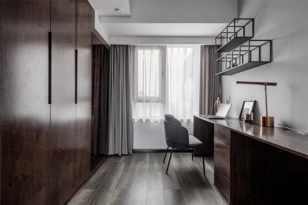 书房的墙面刷成了灰色,双人位的书桌方便屋主夫妻一起工作,书桌上方的置物架和后方满墙的柜子结合起来,就不用担心书房储物空间不够了。