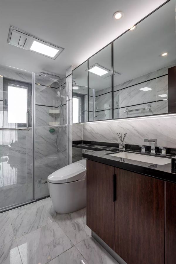 卫生间自然是做了干湿分离的设计,把镜柜延伸到马桶的上方,这样储物空间会更充足一些,和整体相同的配色方案,让卫生间看起来简洁又大方。