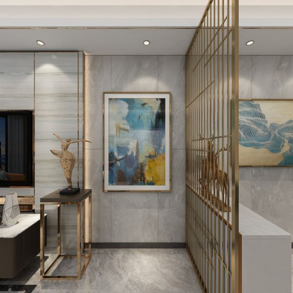 原户型的入户大门正对客厅的观景阳台,没有什么比一扇屏风能更美观且更划算地化解这个鸡肋户型。黄铜独有的金属光泽,搭配屏风的栅栏造型,不会对室内的通风采光产生影响,还能彰显出居主对生活品味的追求。