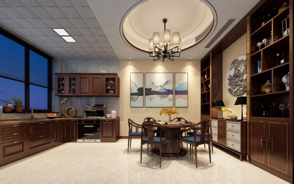 开放式餐厨区设计,隐藏了两功能区的界限,在视觉上达到了扩大空间的效果。红木家具是这个开放空间的联结线,它串起了餐厅与厨房的淳朴情感。