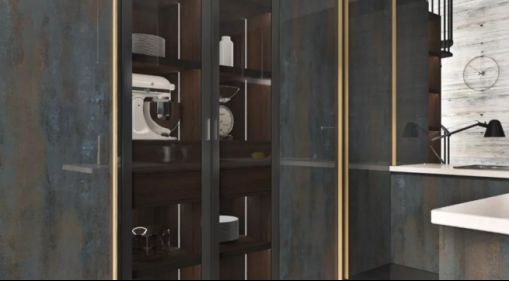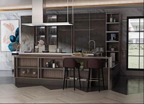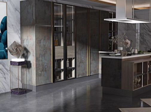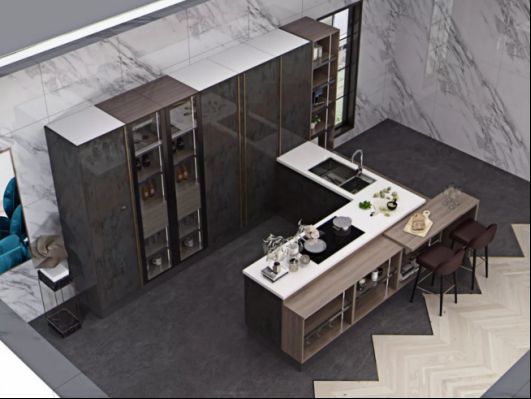 2019年欧派家居全新设计的慕尚Mulsanne橱柜,以高级灰木纹理搭配铁锈灰超晶板、意式简约大气的玻璃门、美观的卡座设计,再加上不经意间流露出低调的奢华内蕴,让原本单调的厨房充满了时尚的生动。