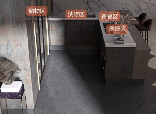 以U型设计为例,厨房的动线安排为冰箱、水槽、灶具呈三角形,而且,洗菜区应置于U形底部,将储藏区和烹饪区分别置于U形的两侧,动线布置合理,提高操作效率。
