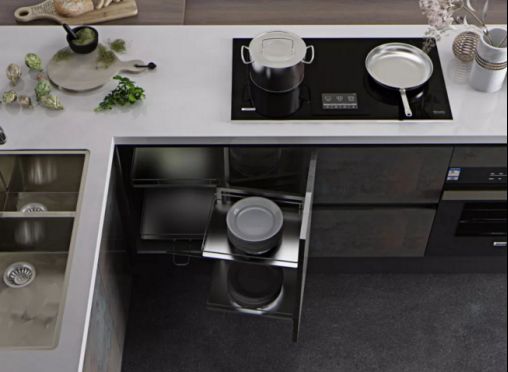 操作台下方拉篮设计,不仅可以放置常用碗碟,最大限度地使用橱柜的内置空间,让厨房更整洁,收纳更高效,而且抽取式设计取用起来也更方便。嵌入式家电好看、方便、省空间,既解放了台面空间,杜绝凌乱,还能让厨房风格更美观统一。