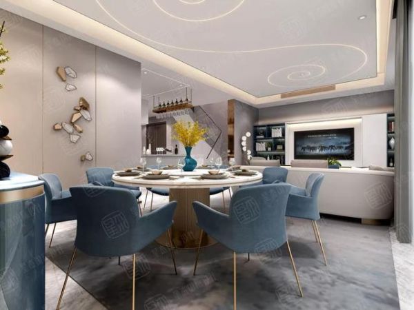 无锡别墅装修设计充满轻奢元素的餐厅布置,营造出优雅的就餐氛围,蓝丝绒餐椅与金色桌脚,赋有高级质感。