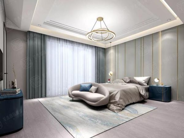 无锡别墅装修设计极度的简洁让主卧空间更具有可塑性,柔和的金属色系呈现高级内敛的质感。