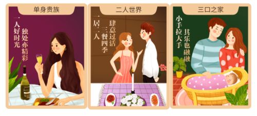 H5以集卡的形式呈现,卡片内容也是经过精心设计,其中“一人好时光,独处亦精彩”、“一居二人,三餐四季”、”一家三口,大手拉小手“分别为单身、二人世界、三口之家状态,符合不同人生阶段的不同居家需求。