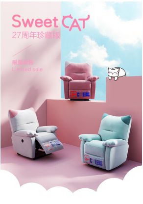 近期,芝华仕推出一款27周年的限量版猫椅沙发,激萌的造型非常可爱,颜色也非常粉嫩,适合功能性之外也对家居时尚有更高要求的女性消费者。它的靠背有2个软萌萌的猫耳,扶手也设计成了肥嘟嘟的猫爪,即使你像猫主子一样挑剔,也不得不为这款产品点赞。