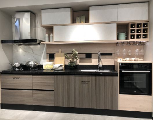 欧铂丽香提可可系列就是典型的一字型布局。这种布局动线都在一条直线上,非常简洁明快。橱柜后面的通道宽敞,操作时不会有任何障碍物影响走动。