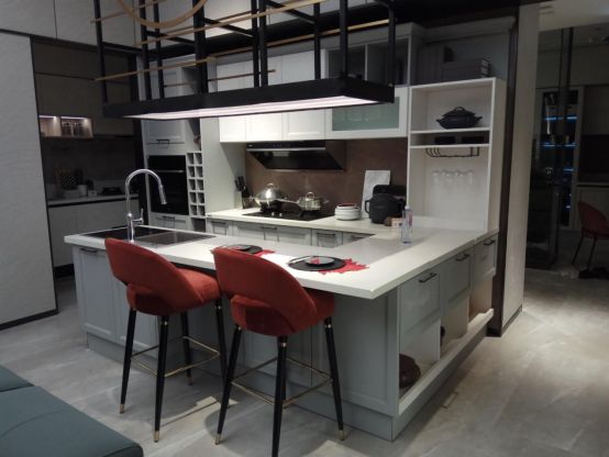欧铂丽米兰风尚系列橱柜就是双一字型厨房布局。厨房功能区也分为两条线: 清洗处理材料、烹饪和装盘、置物摆放,灵活性相比一字型布局要增强不少。除了完善的拉篮、收纳柜和隐藏式冰箱计,米兰风尚橱柜还增加了铝框玻璃门红酒柜设计,既是美酒展示区也是收纳区,轻松提升厨房格调。多功能吧台设计,集用餐、会客功能于一体,是朋友小聚、家人用餐时最贴心的存在。