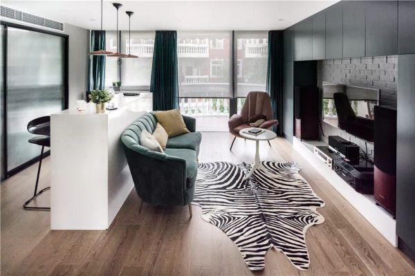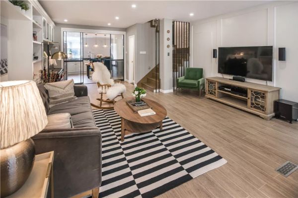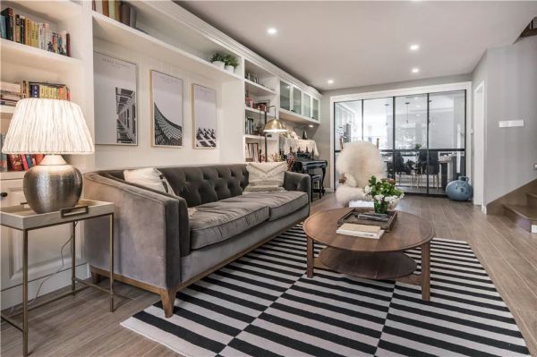 这个客厅的风格偏向于现代美式风,以现代风的简洁硬装为基础,家具选择了更为典雅、大气的款式,然后加入一些石膏线、金属元素作为点缀。