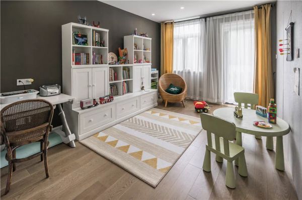 在二楼的另一侧是被改造成了孩子的娱乐区,迷你的小桌椅加上书柜、书桌和地毯等,孩子平时在这里玩游戏和做手工、作业等都很方便。