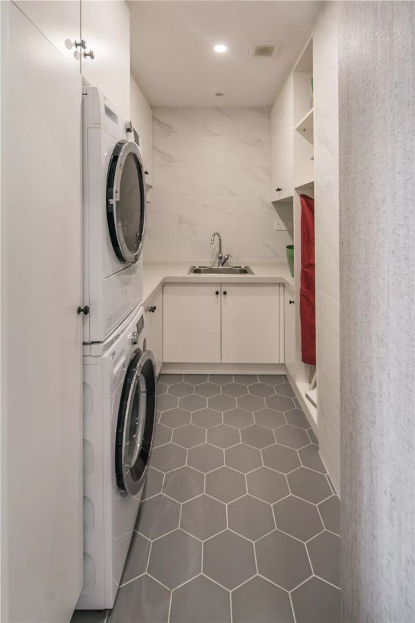 在二楼有着一个独立的洗衣房空间,屋主把洗衣机、烘干机都放在了这里,然后周边也做了洗手台和储物柜,这样一个杂物间也很让人羡慕。