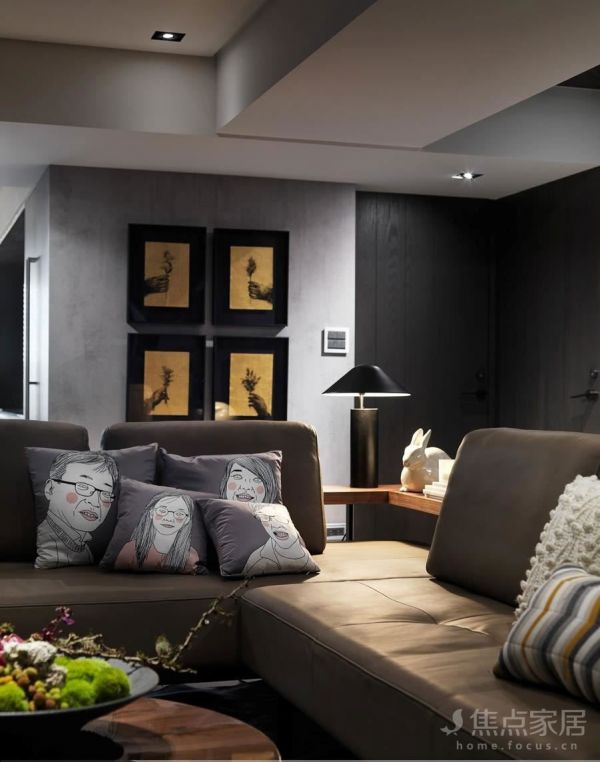 在色彩规划上,全屋以黑、白、灰为基调,再利用客厅的暖色系沙发及金黄色的绘画作品,成功创造视觉亮点。沙发背后的黑板牆,则由手工绘制的漫画风的插图,结合同系列抱枕,让家庭成员,跃升为空间主角,也让空间更为人性化。