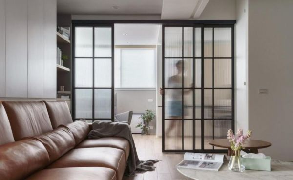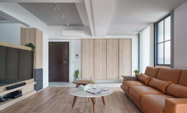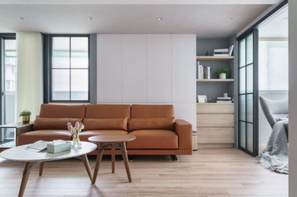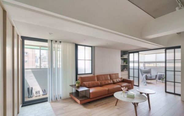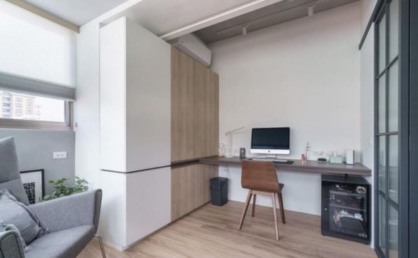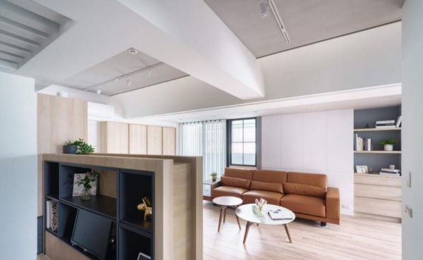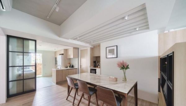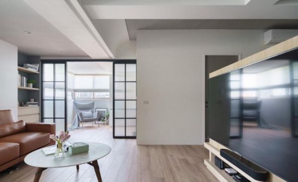 弥漫日式无印风悠哉惬意的气氛,100平方的空间里随处都有自然光线洒落,浅木与白漆堆砌出的新居完全看不出是超过15年屋龄的老房子。推开大门即见宽敞的客厅,玄关左侧以整排的悬吊式柜体作为入门收纳区;地面六角花砖到直向铺设的木地板界定了场域。客厅的场景是专属夫妻俩的阳光秘境,是办公室也是私人休憩区,长虹玻璃滑轨拉门让隐私更有弹性。
