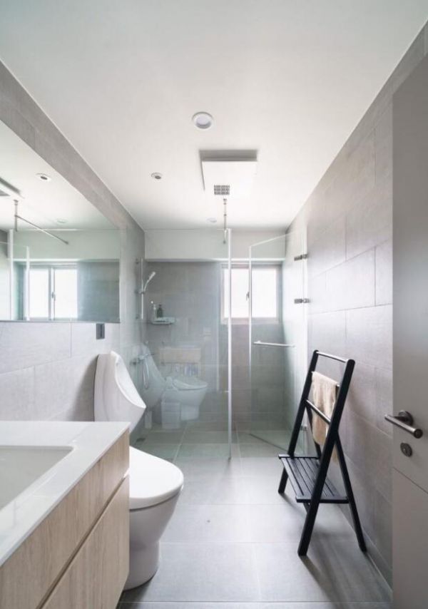 电视矮墙对齐结构柱自然地划分餐厨界线,电视墙的另一面是温馨的用餐区;餐厨区域墙面的畸零空间设计成摆放咖啡机与酒柜的小吧台。开放式厨房一样用玻璃拉门区隔空间,炒菜炖煮时可以阻隔油烟,完全敞开则变成阳光厨房,方便招待亲友、来场阳光午茶共享周末假期。客浴除了干湿分离的卫浴与免治马桶,还特地安装小便斗,从细节表现贴心的待客之道。