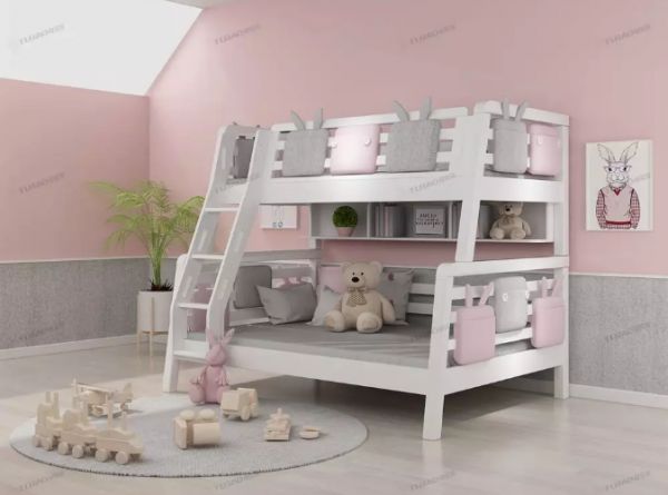 搭配心得:整体选择的时候,我是考虑到孩子可能现在并不是非常确定自己想要什么,于是我在兔宝宝儿童家居里选择了这款简单又不失童趣的“魔法兔和精灵背包”高低床。它是一款中性床,能根据软包来调节男女,而且这个软包的造型非常可爱,是兔子耳朵,我家孩子非常的喜欢,高低床的款式对她来说也很有趣味,下床平时用来睡觉,上床她会当自己的秘密“小基地”,偶尔也会邀请我们上她的“小基地”玩耍,很有小主人当家的感觉。