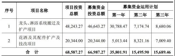 据松霖科技2018年10月9日更新的招股书披露,企业拟在上交所公开发行不超过4100万股,占发行后总股本的比例不低于10%,拟募集资金约6.7亿元。其中,4.66亿元用于龙头、淋浴系统搬迁及扩产,2.03亿元用于花洒及其配件扩产及技改。