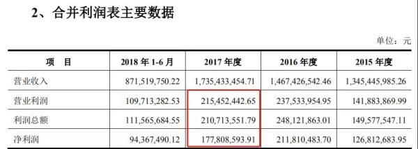 2015年-2017年,松霖科技营业收入分别为13.45亿元、14.67亿元、17.35亿元,营业利润分别为1.42亿元、2.38亿元、2.15亿元,净利润分别为1.27亿元、2.12亿元、1.78亿元。其中,2017年营收数额虽然活得增长,但营业利润同比下降9.66%,净利润同比下降16.04%。
