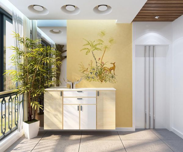 《林间语》奶油色的背景色清爽明亮,在阳光的照射下,整个空间更显温馨舒适。画面中灵动的鸟兽,明艳的花草和谐共语,将自然赋予生命的灵气缓缓流出,搭配一丛文竹,让人顿觉宁静祥和、悠然自得。