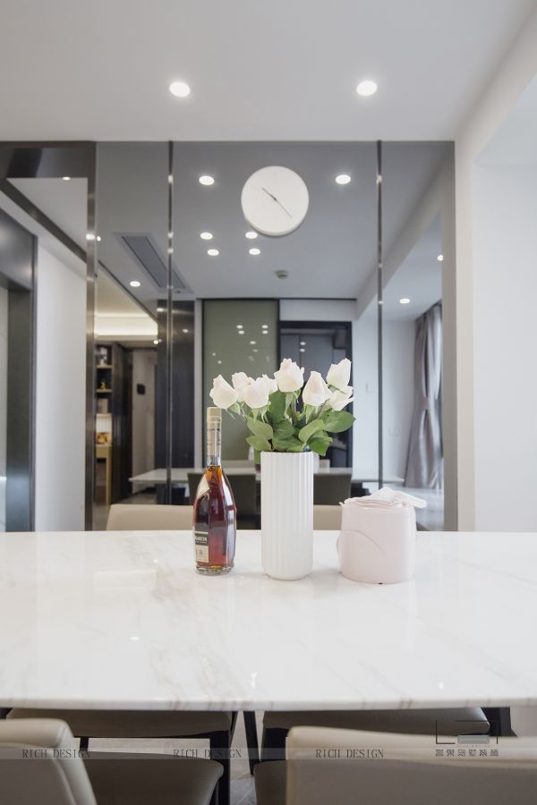 餐厅中的墙面做了镜面处理,从视觉上拓宽了餐厅的空间,同时提高了明亮度。白色的大理石餐桌简约而百搭,桌上的插花盆栽随意摆放着,散发着浓厚的生活气息。