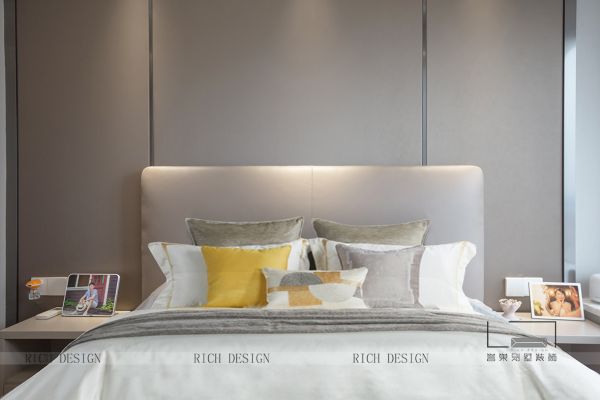 生活的诗意万象浮现于点滴日常,艺术的美感亦通过细节延展出诗意的具象。主卧中采用了对称式的艺术构造,整体形象平衡沉稳又不乏美感。柔软亲肤的床品以简洁迷人的白色为基底,用小面积的黄与灰加以点缀,更显灵动。