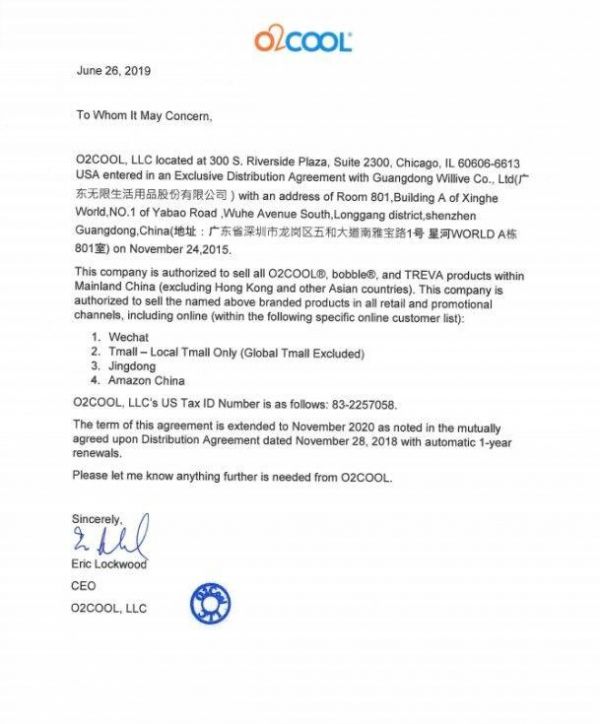 6月26日,广东无限生活用品股份有限公司(以下简称无限生活)与美国O2COOL品牌达成2020年中国总代理协议,这也是无限生活连续六年成为美国O2COOL中国授权总经销商;