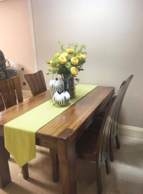 餐桌、餐椅的造型沉稳大方,宽敞的餐桌可以同时容纳6-8人用餐。草绿色餐桌布让低调的餐桌多了几丝俏皮,再摆上精心准备的插花装饰,简单的餐厅变得更加生动而舒适。