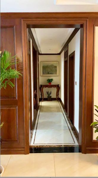 客厅通往其他空间,由一条狭长的走廊衔接,走廊保持干净素雅的格调,只是在走廊尽头放置了玄关柜,一幅挂画加以点缀。