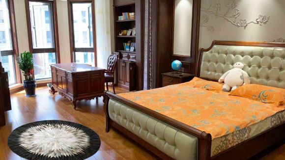 莹润的乌金实木,木质本身深厚高雅的韵味,加上温婉质朴的布艺花纹,便已经奠定了整个空间基调。端庄低调的实木家具配上白墙,显得特别素雅,温馨自然。再搭配一组山水挂画,古典韵味与现代时尚结合出了非凡的气质。