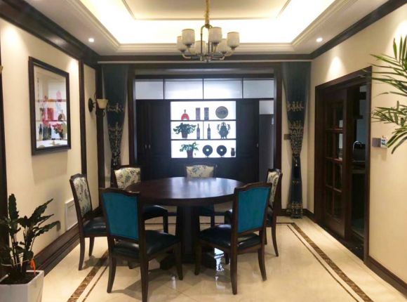 餐厅空间的装饰十分丰富,餐桌椅占据主导位置,定制橱柜提供了丰富的收纳与展示空间,避免杂乱无章的置物感觉。在以沉稳的实木色调为主的空间里,蓝色的椅背显得跳脱可爱,在素雅之中增添一抹靓丽。