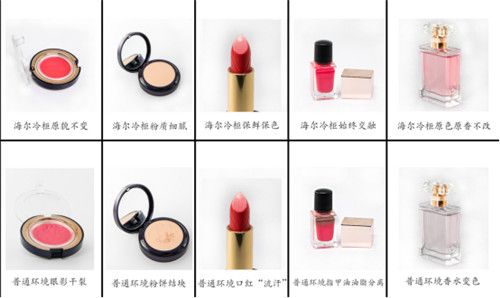 观其形!在使用化妆品时,你是否遇到过满心欢喜地打开一个月没用的眼影,竟然出现一道道裂痕,用刷子轻轻一扫,还结成各种小块。实验中,不仅是眼影,粉饼也出现同样地现象,口红表面也附着一层“汗珠”。与之不同的是,海尔网红柜中的粉饼粉质细腻,口红始终硬挺。